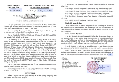– Ngày 31 tháng 12 năm 2024 Ủy ban nhân dân Tỉnh Ninh Bình ban hành Quyết định số 987/QĐ-UBND; về công bố Đơn giá xây dựng tỉnh Ninh Bình năm 2024. Bộ đơn giá là cơ sở để các cơ quan, tổ chức, cá nhân áp dụng trong công tác lập và quản lý chi phí đầu tư xây dựng các công trình trên địa bàn thành phố Ninh Bình.